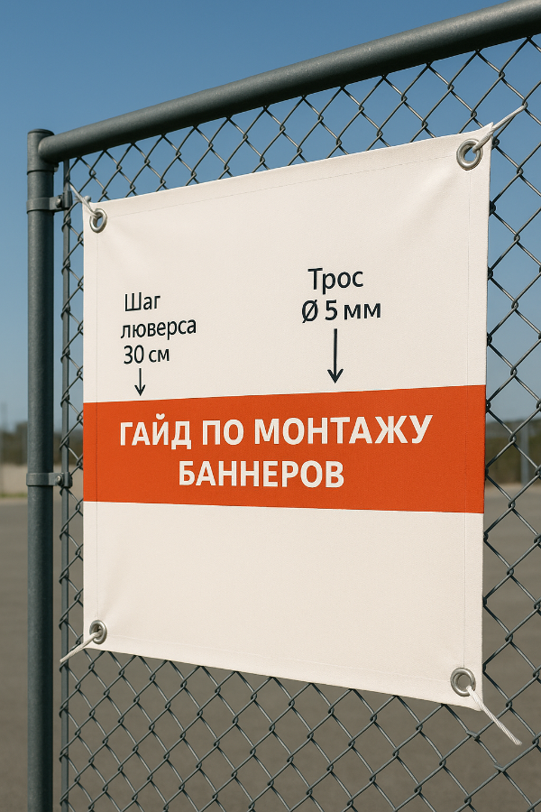 Полотно: ПВХ-баннер 440–510 г/м² для стандартных задач. Для ветреных мест — баннерная сетка (mesh), пропускающая до 37% воздуха.