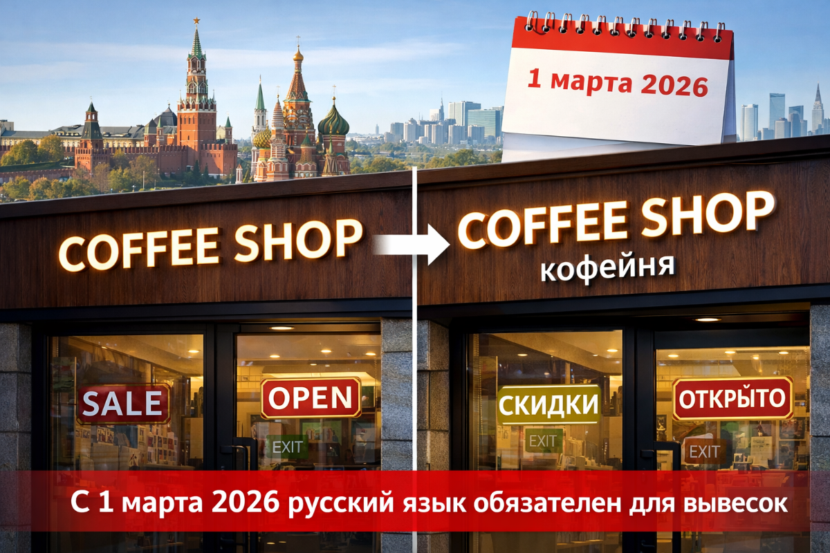 С 1 марта 2026 года вступают в силу требования к использованию русского языка в информации для потребителей (Федеральный закон № 168-ФЗ). Это касается вывесок, витрин, табличек, навигации внутри помещений, режима работы и других надписей, которые видит клиент. Если на фасаде вашего магазина, салона красоты, кофейни, шоурума, медицинского центра или офиса используются надписи вроде Coffee, Shop, Beauty Studio, Sale, Open — их необходимо адаптировать под новые правила.