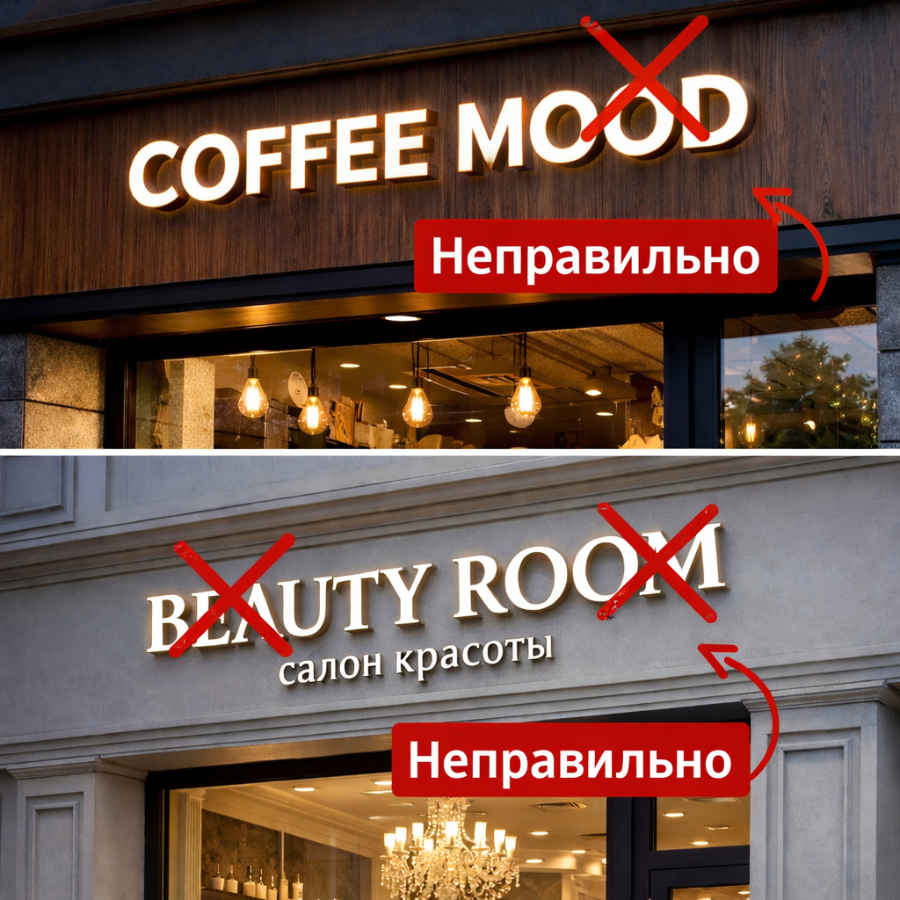 Самая распространённая ошибка — использование только латиницы без русской части. Также проблемы возникают, если русский текст слишком мелкий и визуально незаметен, отсутствует описание деятельности, используется транслитерация вроде «СЕЙЛ», или английское слово занимает доминирующее положение.