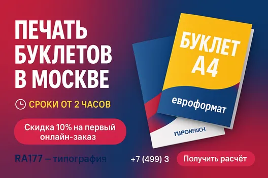 Типография RA177 предлагает профессиональную печать рекламных и информационных буклетов в Москве. Работаем с физическими и юридическими лицами, обеспечиваем точную цветопередачу и быструю доставку.