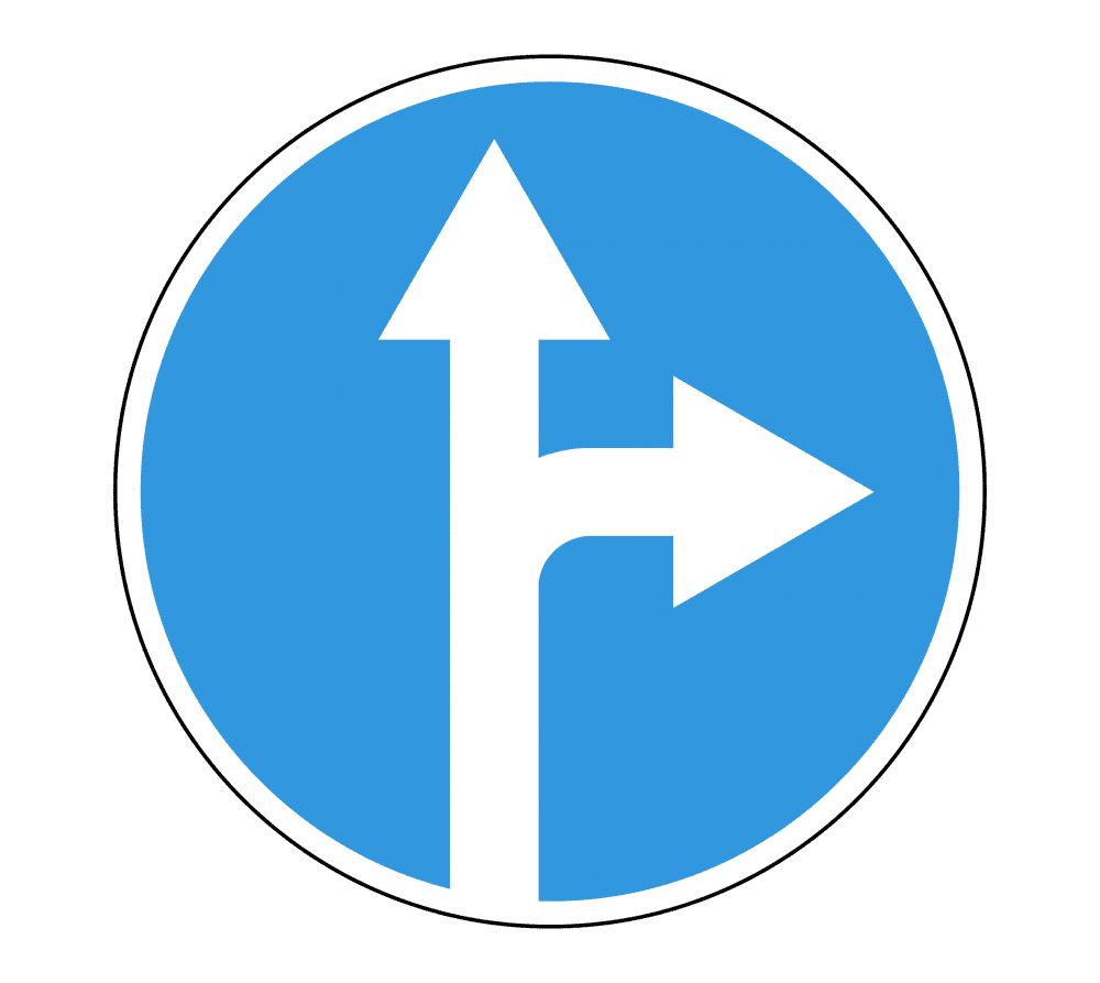 - Форма и размеры: Круглый знак с синим фоном и двумя белыми стрелками, указывающими направления — прямо и направо. Стандартный диаметр знака — 600 мм, доступны также размеры 700 мм и 900 мм.