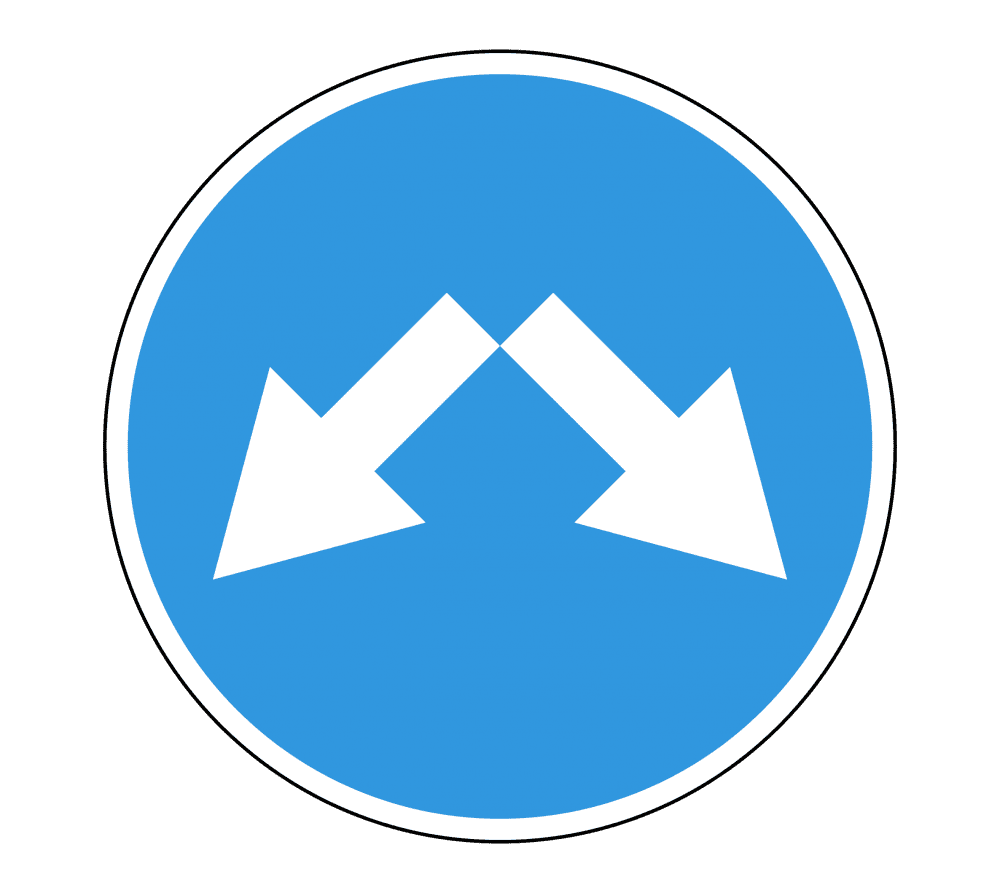 - Форма и размеры: Круглый знак с синим фоном и двумя белыми стрелками, указывающими направления объезда — вправо и влево. Стандартный диаметр знака — 600 мм, также доступны размеры 700 мм и 900 мм.